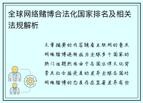 文章摘要的内容:随着互联网的普及,网络赌博逐渐成为全球多个国家的热门话题。然而,由于各国法律、文化背景及社会接受度的差异,全球各国对网络赌博的态度存在显著差异。有些国家选择合法化网络赌博,以促进经济发展和管理风险;而另一些国家则保持严格禁令,强调保护公民免受网络赌博可能带来的社会负面影响。本文将从四个方面进行详细分析:全球网络赌博合法化的国家排名、合法化国家的主要法规、合法化背后的社会与经济因素、以及网络赌博的国际监管趋势。在这四个方面的阐述中,将探讨各国的网络赌博政策、法规框架及其对社会经济的影响,帮助读者全面了解网络赌博在全球范围内的法律化趋势及相关法律规定。